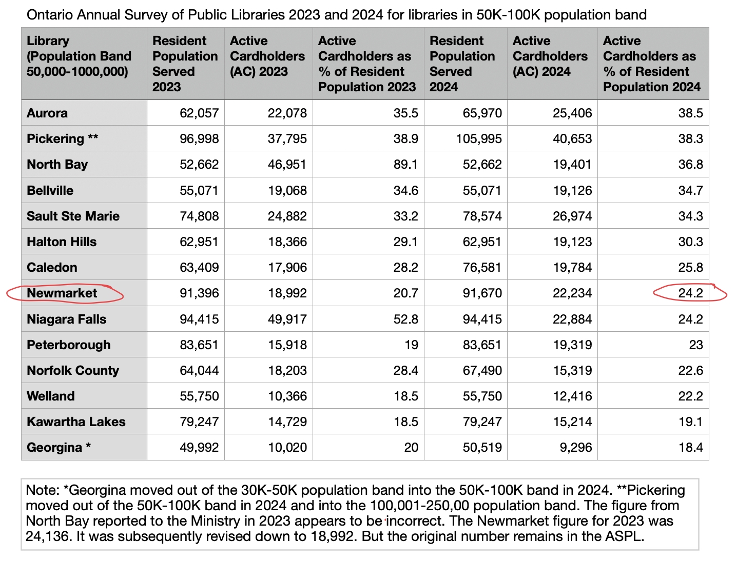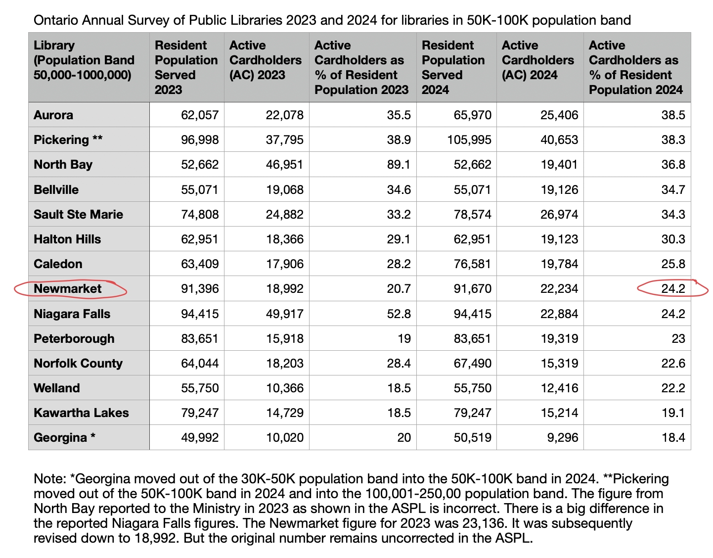 Our next-door neighbour, Aurora Public Library, has one branch like us but serves a smaller population. In 2024 (the last year for which figures are available) 38.5% of Aurora’s population were “active cardholders” compared with Newmarket’s 24.2%. Newmarket’s percentage for 2025 will be going up to 30.5% or thereabouts. (We don’t know the Town’s latest population figure.)