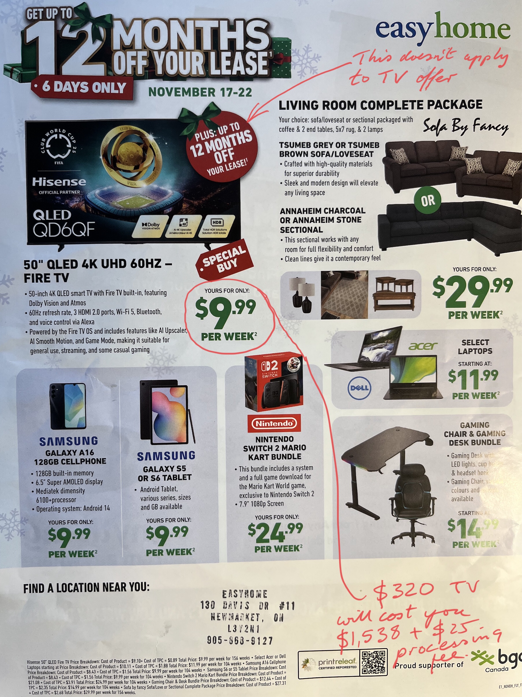 But it’s not immediately obvious that doesn’t apply to the TV where the weekly payment is $9.99 and the "12 months off" offer only applies to weekly lease payments of $15.99 a week or more.