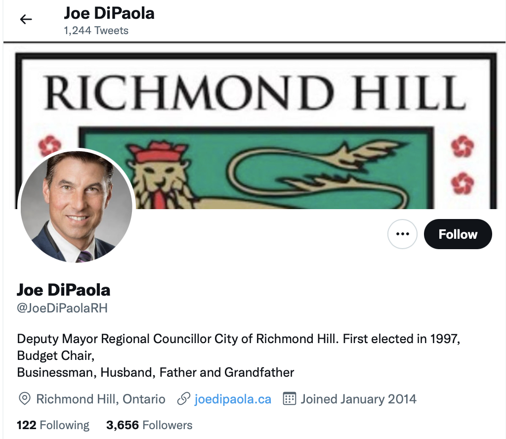 Richmond Hill’s Joe DiPaola who ran against Carmine Perrelli a few months ago for Mayor of Richmond Hill (both losing to David West) takes a swipe at Perrelli but without mentioning him by name: