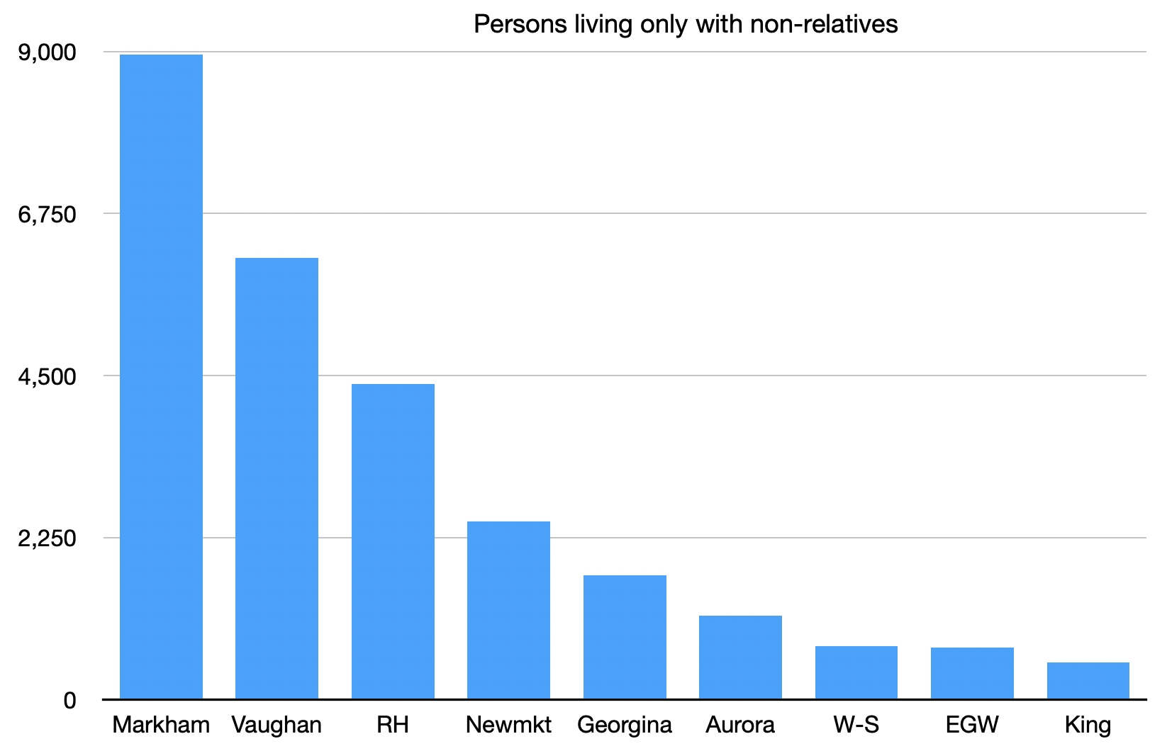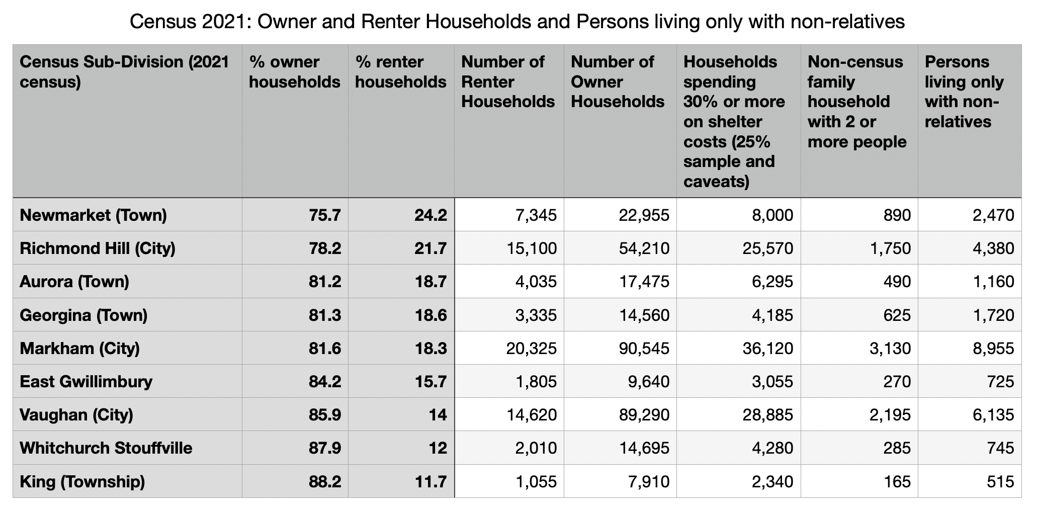 The 2021 Census tells us Newmarket has the highest percentage of renter households in York Region. And 2,470 people in Town are living only with non-relatives. (See table below)