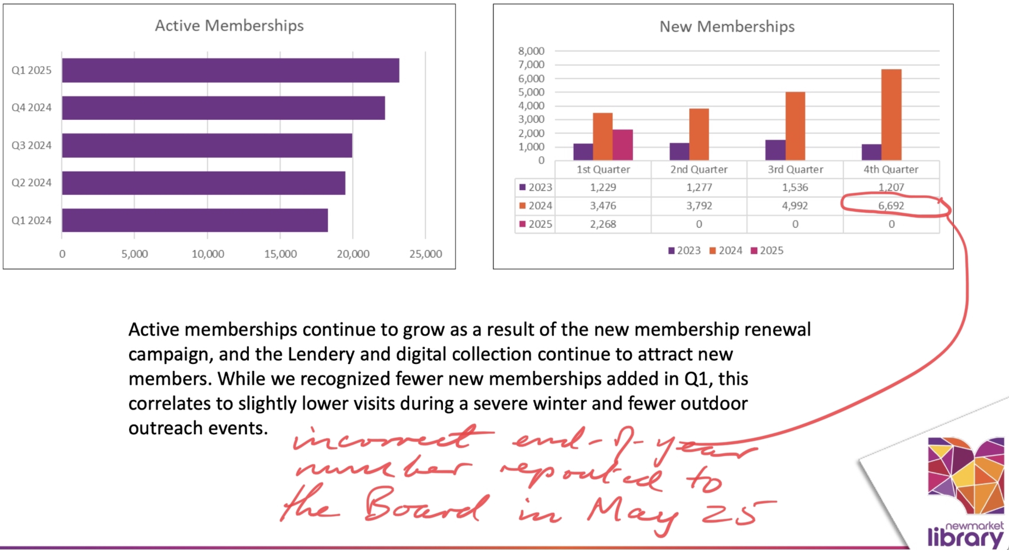 She updated the 24,136 Active Library Cardholders for 2023 (see graphic above) to a new lower one (18,992) which allowed the Library to assert there had indeed been an increase in membership.